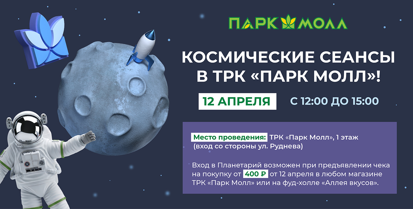 12 апреля с 12:00 до 15:00 — погрузитесь в космическое путешествие в Планетарии! Сеансы проводятся каждые 15 минут в порядке живой очереди.